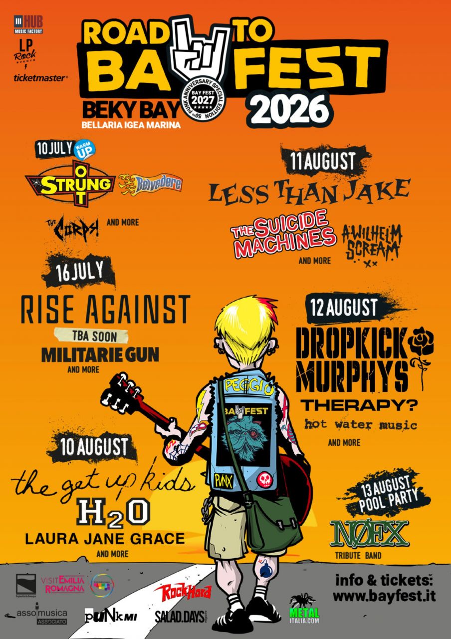 Un concentrato di punk rock internazionale, tra leggende e protagonisti contemporanei: al Beky Bay cinque giorni di musica e adrenalina con Dropkick Murphys, Less Than Jake, Rise Against, Strung Out e The Get Up Kids, affiancati da A Wilhelm Scream, Belvedere, H2O, Hot Water Music, Laura Jane Grace, Militarie Gun, Suicide Machines, The Corps e Therapy?.