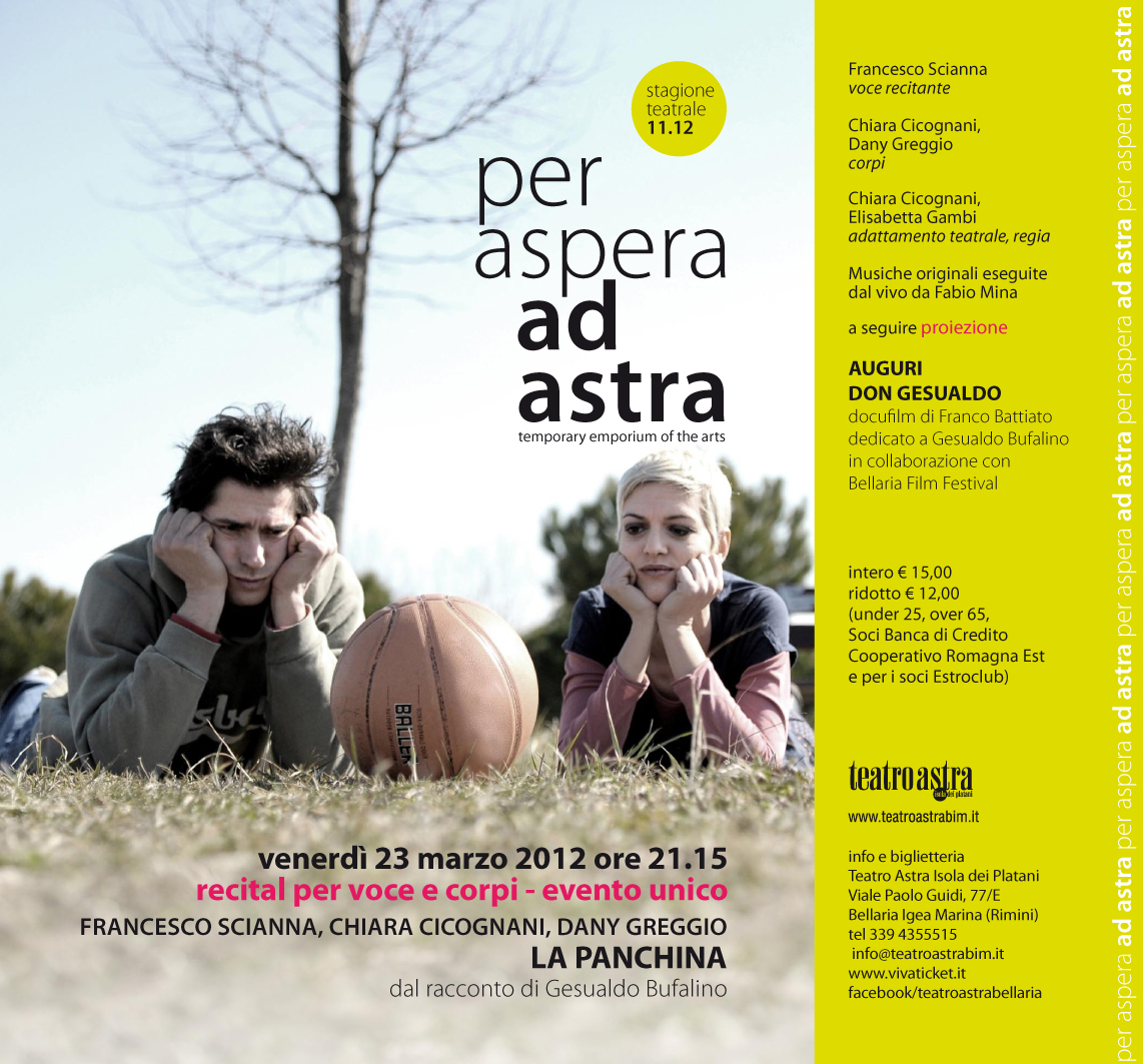 La panchina, breve racconto di Gesualdo Bufalino dalla raccolta “L’uomo invaso”, narra il casuale incontro tra un anziano signore prossimo alla cecità, una giovane bambinaia tormentata da un amore empio e un bambino curioso e ironico. La lettura di Francesco Scianna accompagna l’azione scenica sul palco di Chiara Cicognani e Dany Greggio.