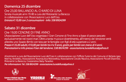 L’Associazione Luce dell’Uso organizza il gran Cenone di Fine Anno a base di pesce pescato esclusivamente nei nostri mari e cucinato dai nostri marinai. Musica e divertimento, all’interno del Villaggio verrà inoltre allestito uno spazio bimbo con tata per le famiglie con figli a seguito di età superiore a 2 anni.